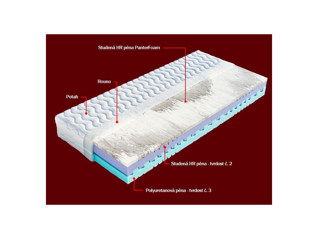 Pohodlná matrace s možností volby dvou tvrdostí je vybavena speciální pěnou PanterFoam (50 kg/m³), která vyniká vysokou elasticitou, prodyšností, rychlým odvětráváním vlhkosti a dlouhou životností. Díky výborné ventilaci nabízí pocit čistoty a svěžesti při každém odpočinku.